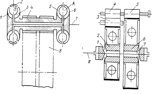 Механическая реверсивная передача может быть выполнена по схеме, представленной на рис. 1.5. Принцип действия реверсивного редуктора основан на применении двойного комплекта ведущих шестерен и ведомых колес, расположенных между входным и выходным валами редуктора. Так, при движении судна передним ходом крутящий момент от ГТД передается через шестерню 5 колесу 6 и далее — через включенный фрикцион переднего хода 7—на выходной вал редуктора 8. При движении судна задним ходом крутящий момент от ГТД передается на шестерню 4, паразитную шестерню 3, колесо заднего хода 2 и далее через включенный фрикцион заднего хода 1 на выходной вал редуктора 8.