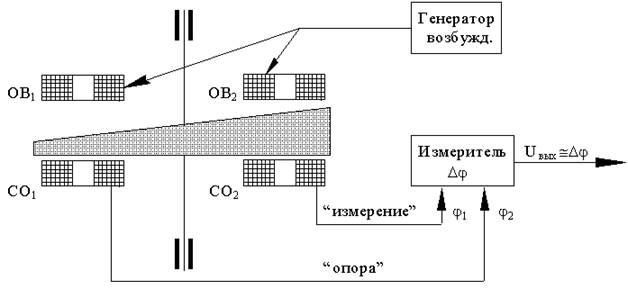 На фазоизмеритель подаётся напряжение с двух сигнальных обмоток, сигнал в одной из которых является опорным, а в другой - измеряемым.