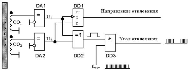 Схема обрабатывает сигнал поступающий с ДУ, конструкция которого представлена на рис.2. Компараторы DA1 и DA2 преобразуют синусоидальное напряжение поступающее с обмоток ДУ в прямоугольные импульсы не изменяя при этом фазу сигнала. Сигнал с обмотки СО1 является опорным. Передний фронт импульса напряжения U1 разрешает переключение триггера DD1 в состояние, определяемое логическим уровнем сигнала U2 , знак которого в момент прихода фронта U1 определяется знаком разности фаз напряжений U1 , U2 . Одновременно импульсные последовательности U1 и U2 поступают на логический элемент DD2 (“исключающее ИЛИ”), на выходе которого дважды за период напряжения питания ДУ появляется сигнал логической единицы, длительность которого пропорциональна разности фаз напряжений U1 , U2 . Этот сигнал управляет прохождением тактовых импульсов fтакт ,число которых в пачке на выходе DD3 будет пропорционально разности фаз U1 , U2 и следовательно пропорционально углу поворота ротора.