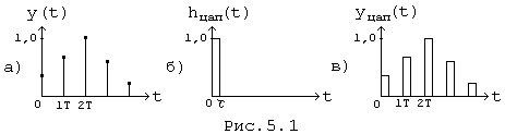 На рис. 5.1, а,в показана форма сигналов на входе и выходе ЦАП на примере импульсной характеристики в форме прямоугольного импульса длительностью t (Рис. 5.1, б)