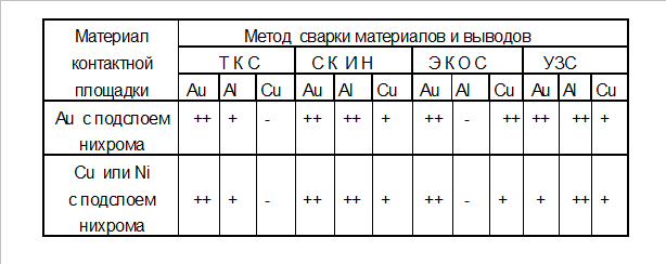 Предпосылками для получения качественного сварного соединения методом термокомпрессионной сварки являются: высокая пластичность проволоки, а также высокая взаимная диффузия в твердой фазе свариваемых материалов. В соответствии с этим предпочтительными материалами для выводов являются золото и алюминий. При сварке Au и Al в результате взаимной диффузии и нагрева возможно образование интерметаллических соединений (AuAl2 , Au2 Al? AuAl и др.) некоторые из них хрупкие и рыхлые, что снижает прочность соединений.