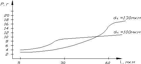 На рис. ... приведены зависимости P=f(l) для случаев использования сварочных инструментов с рабочим торцом Æ100, 130 мкм. Согласно рисунку 9 при l=30 мкм (Æ100) прочность стабилизируется, однако, окончательная стабилизация прочности наступает при l=40-50 мкм, т.к. при l=30 мкм имеет место отрыв по месту сварки в 50% случаев, из-за напряженного состояния узла.