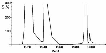 В соответствии с работой [9] для возникновения СДС необходим противоположный дезорганизующий, рассеивающий фактор. Для рассматриваемой социальной системы нет необходимости доказывать наличие этого фактора ни в 1905г., ни в 1917г. Очевидна роль дезорганизующих факторов и в годы реформ. Об усилении дезорганизующих факторов после разрушения ССДС (1991г., 1993г.) в настоящее время имеется много фактов. Следует перечислить основные: разрушение великой страны, деиндустриализация производства, уменьшение объемов производства более чем в два раза, резкое возрастание межнациональных и других конфликтов, частичная потеря возможности осуществления фундаментального принципа развития технологии – принципа специализации, нарушения в воспроизводстве трудовых ресурсов и всего населения и другие острые и кризисные явления, существенно дестабилизирующие систему, что объективно отражает третий пик кривой изменения S на рис.1. Размеры этого пика свидетельствуют о масштабах национальной катастрофы в годы реформ, соразмерной двум предыдущим общенациональным катастрофам 1917г. и 1941г.