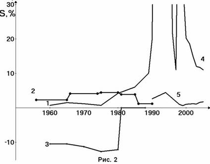 Катастрофическое изменение S (см. пик 2 рис.№1), вызвано ВОВ (1941 – 1945 гг.). В результате экономического регулирования правительства Советов S было понижено (менее 1.5 % в год) при беспрецедентном по длительности периоде стабильности с 1960 по 1980 г.г., что явилось, вероятно, рекордным процессом за всю многовековую историю России (см. рис. 1 и рис. 2, ветвь 1). Еще более уникальным является изменение S для ГДР (ветвь 3 на рис. 2), вероятно рекордная стабильность для всего мирового процесса того исторического периода. Из анализа рис.2 также допустимо сделать вывод о возможности обратного «фазового» кинетического перехода при конкретных исторических условиях (во многом специфических) из социалистической системы в капиталистическую без формальных катастрофических потерь в национальном масштабе. Хотя, по мнению аналитиков, развитие Германии будет длительное время тормозиться огромными затратами на продолжающиеся процессы объединения и выравнивания. Из совместного анализа рис.2 и рис. 3 можно предположить, что дестабилизация экономики стран, членов Совета экономической взаимопомощи (СЭВ), началась с восточно-европейских социалистических стран. При совместном рассмотрении рис. 2, 3, 4 можно установить взаимные влияния экономик представителей стратегических конкурирующих блоков мировой системы того исторического периода в Европе.