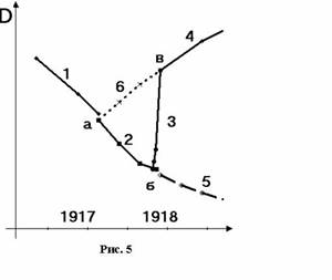 На рисунке 5 приведена принципиальная бифуркационная схема основных событий «фазового» перехода в России 1917г., построенная без учета интервенции и других издержек переходного процесса, где: