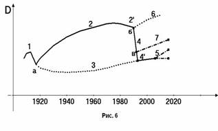 На рис. 6 приведена принципиальная бифуркационная схема, построенная без учета интервенции (1919-1921г.г.) и ВОВ (1941-1945), где Д – доходы трудящихся, линии: