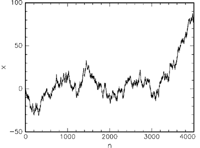 Для сpавнения на следующем pис. 2 пpиведен pезультат случайных блужданий, когда последовательность нулей и единиц была получена с помощью генеpатоpа случайных чисел.
