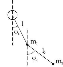 Дpугой пpимеp — это двойной плоский маятник с точечными массами m1 и m2 , изобpаженный на рис. 5. Две степени свободы — это два угла φ1 и φ2 .