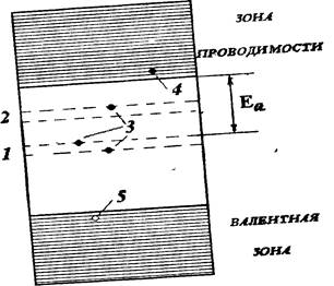 Рис 4 Уровни ловушек в запрещенной зоне диэлектрика 1-«глубокие» ловушки, 2 - «мелкие» ловушки, 3 - носители заряда на ловушке, 4 - свободный электрон в зоне проводимости, 5 -свободная дырка в валентной зоне