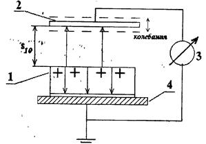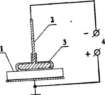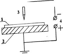 Рис.9 Электризация в коронном разряде: 1 - диэлектрическая пленка, 2 - металлический электрод;3 -игла, 4-источник высокого напряжения
