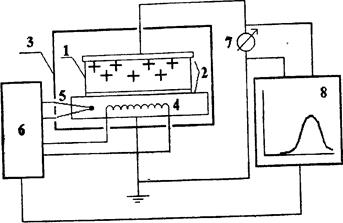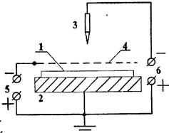 Рис 10 Устройство коротрона- I - электризуемый диэлектрик, 2 - нижний электрод. 3 - игла, 4 - сетка, 5 - источник постоянного напряжения сетки, 6 - источник высокого напряжения