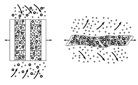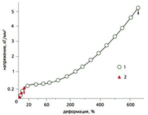 Более того, полимеры, деформированные в адсорбционно-активной среде, - это готовые разделительные мембраны. Мембраны, имеющие размер пор 1-10 нм, служат для очистки жидкостей и газов, для разделения разного рода смесей, в частности для опреснения морской воды путем обратного осмоса. Самые распространенные разделительные мембраны получают с помощью сложных и трудоемких процедур. Так, ядерные фильтры изготавливают, облучая полимерную пленку потоком тяжелых ионов, а затем протравливая места их проникновения (треки) с помощью агрессивных химических веществ [4]. В результате пленки приобретают сквозные цилиндрические отверстия. Широко используются мембраны, получаемые при фазовом разделении растворов полимеров. В этом случае в строго контролируемых условиях в раствор полимера добавляют осадитель, в результате чего полимер выделяется в осадок. Последующая сушка осадка дает пористую полимерную пленку, которая и работает затем разделительной мембраной. Регулируя условия фазового разделения, можно получать пористые пленки с порами различных размеров [5].