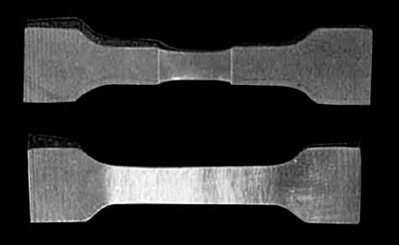 Возвращаясь к теме нашей статьи, отметим, что в полимерах эффект Ребиндера проявляется весьма своеобразно. В адсорбционно-активной жидкости возникновение и развитие новой поверхности наблюдается не только при разрушении, а значительно раньше - еще в процессе деформации полимера, которая, как было отмечено выше, сопровождается ориентацией макромолекул. На рис.2 представлены изображения двух образцов одного и того же полимера (конкретно - лавсана, из которого изготавливают, в частности, столь хорошо всем знакомое текстильное волокно), один из которых был растянут на воздухе, а другой - в адсорбционно-активной жидкости. Хорошо видно, что в первом случае в образце возникает шейка, о которой речь шла выше. Во втором случае пленка не сужается, зато становится молочно-белой и непрозрачной.