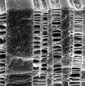 И, наконец, еще одна особенность: оказывается, с помощью крейзинга можно придавать полимерным пленкам и волокнам поперечный рельеф. Вообще говоря, создание рельефа не представляет серьезной проблемы в случае волокон и пленок, формуемых из расплава. Обычно изготовление синтетического волокна имеет две стадии. На первом этапе расплав синтетического полимера продавливают под давлением через пластину, имеющую маленькие отверстия (фильеру), после чего этот расплав твердеет при остывании. В результате полимер превращается в большое количество тоненьких (10-100 мкм) ниточек. Это так называемая стадия формования волокна. Затем полученные ниточки вытягивают для улучшения их механических свойств (стадия ориентационного вытягивания). Так вот, если на первой стадии формования расплав полимера продавливать через отверстия, имеющие сложную конфигурацию, например в виде звездочек, то образующееся волокно также будет иметь на поверхности рельеф, соответствующий этой конфигурации. Однако в этом случае волокно приобретает только продольный рельеф. Наиболее же ценные с точки зрения потребительских свойств природные волокна имеют хорошо выраженный поперечный рельеф.