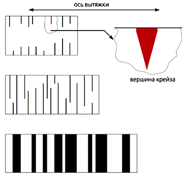 I - инициирование крейзов, II - рост крейзов, III - уширение крейзов.