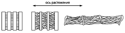 Рис. 5. Схема, иллюстрирующая коллапс структуры полимера, происходящий при больших значениях деформации в адсорбционно-активной жидкости, на различных стадиях растяжения.