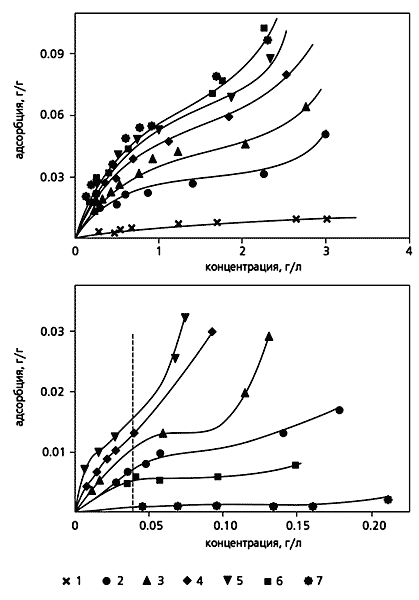 На рис.6 представлены изотермы адсорбции двух веществ - йода (а) и родамина С (б) - из их водных растворов. Хорошо видно, что полимер, растянутый в жидкости, действительно становится эффективным адсорбентом, способным поглощать любые низкомолекулярные вещества из их растворов. Причем эффективность адсорбции зависит как от величины деформации полимера, так и от молекулярных размеров сорбируемого вещества (молекулы йода имеют размер ~0.5 нм, а молекулы родамина С - 17.5 нм), рис.7.