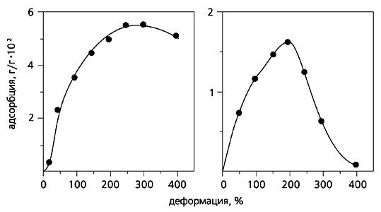 Из рисунка хорошо видно, что адсорбция йода при малых степенях удлинения возрастает, а затем, достигнув максимума, перестает изменяться, в то время как более объемные молекулы родамина С в области 200%-го удлинения демонстрируют резкий спад адсорбции. Очевидно, крейзы, возникающие на первых этапах растяжения, содержат пустоты больших размеров, легко доступные даже крупным молекулам родамина С. По мере вытяжки крейзы разрастаются, что увеличивает площадь межфазной поверхности полимера, и, соответственно, возрастает адсорбция. Но когда начинается описанный выше структурный переход, приводящий к сжатию структуры и уменьшению эффективного диаметра пор, сокращается число пустот, доступных молекулам сначала родамина С (начиная со 250%-го удлинения), а затем и йода (с 300%-го). Таким образом, существует метод разделения молекул путем адсорбции из раствора тех из них, которые способны проникать в поры данного размера (молекулярно-ситовый эффект). Поскольку размер пор можно легко регулировать, изменяя степень вытяжки полимера в адсорбционно-активной среде (используя эффект Ребиндера), легко добиться избирательной адсорбции.