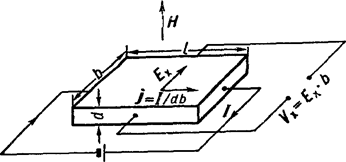 где a угол между векторами Н и J (a <180° ). Когда H ^ j , то величина поля Холла Ех максимальна: Ex = RHj . Величина R , называемая коэффициентом Холла, является основной характеристикой эффекта Холла. Эффект открыт Эдвином Гербертом Холлом в 1879 в тонких пластинках золота. Для наблюдения Холла эффекта вдоль прямоугольных пластин из исследуемых веществ, длина которых l значительно больше ширины b и толщины d , пропускается ток: