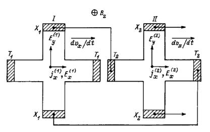 Указаны направления: знаком Å — магнитного поля Bz ; стрелками — ускорения dVx /dt; полей Холла E(1) y , E(2) y ; плотностей тока j(1) x , j(2) x .