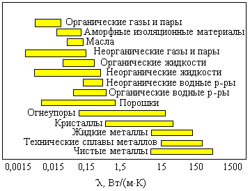 Основной показатель качества теплоизоляторов – коэффициент теплопроводности. Он является физическим параметром вещества и в общем случае зависит от температуры, давления и рода вещества. В большинстве случаев коэффициент теплопроводности определяется экспериментально с помощью различных методов. На рисунке показаны примерные значения коэффициента теплопроводности для