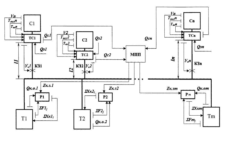 Для обеспечения данного баланса в систему управления вводим микропроцессорное устройство МПУ, на который поступают значения потребленного тепла от всех потребителей. На основе полученной информации МПУ посылает сигналы управления Zк1…Zкm соответственно на регуляторы технологических параметров каждой топки Р1…Рm, с помощью которых регулируется количество тепла вырабатываемого котлоагрегатами топок Qк.о1…Qк.о.m. При этом может изменяться как количество работающих котлоагрегатов, так и мощность, с которой они работают для обеспечения необходимого количество тепла с минимальными потерями.