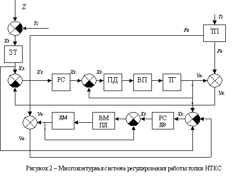 Для обоих контуров регулирования вводим обратную связь по температуре НТКС. Данный параметр измеряется с помощью ТП, на которую влияет температура НТКС Тс. В контуре регулирования по твердому топливу выходной сигнал с нее Fв суммируется с Ув1 , и их суммарный сигнал Ув2 через обратную связь поступает на сумматор, где суммируется с управляющим сигналом с ЗТ Хз2 и на РС уже действует сигнал Хз3 .