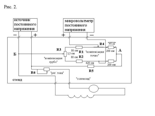 На рис.2 приведена электрическая схема установки для измерения магнитострикции. Схема собрана в виде стенда с клеммами для подключения внешних приборов, а именно: источника постоянного напряжения 10В. и микровольтметра постоянного тока. Через клеммы также подключается тензодатчик исследуемого образца и источник постоянного магнитного поля (соленоид). Измерительный проволочный тензодатчик ИТД является одним из плеч измерительного моста, во второе плечо которого включен компенсационный тензодатчик КТД, наклеенный на стальную полоску, находящуюся вне магнитного поля. Два других плеча измерительного моста образованы прецизионными резисторами R1 и R2 . Потенциометр R3 служит для грубой компенсации моста, а реоход R4 для точной компенсации. К диагонали измерительного моста через подвижный контакт реохода и клеммы x3,x4 “мкВ”