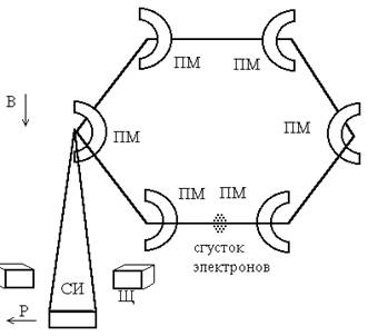 ПМ - поворотные магниты; В - магнитное поле; Р - вектор поляризации фотонов, излучаемых в плоскости орбиты электронов; Щ - щель канала вывода, ограничивающая ширину пучка СИ по горизонтали.
