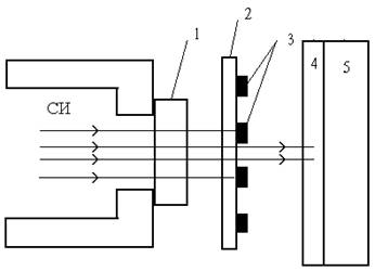 1-вакуумное окно; 2-мембрана рентгеношаблона; 3-маска; 4-резист; 5-рабочая пластина.