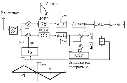 Вторая ветвь схемы служит для фазовой автоподстройки во время разговора. Сигнал умножается (программно) на ключ и инверсное значение ключа, затем сглаживается в интеграторе. Далее формируется сигнал ошибки, который, будучи поданным на опорный генератор, подстраивает его фазу по максимальному абсолютному значению напряжения ошибки.