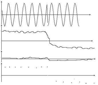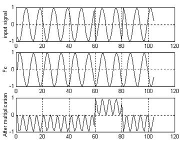 Затем сигнал идет на блоки умножения, на которые также подается с опорного кварцевого термостатированного генератора . Сигналов два, они сдвинуты по фазе относительно друг друга на 180 градусов. Это необходимо для последующего сравнения. Итак, цепь разветвилась. После умножения получается сигнал, изображенный на диаграмме. (моделирование в Matlab 4.2c)