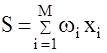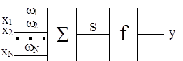 На нейроподобный элемент поступает набор входных сигналов x1 , x2 , ..., xM (или входной вектор X), представляющий собой выходные сигналы других нейроподобных элементов. Каждый входной сигнал умножается на соответствующий вес связи w1 , w2 , ..., wM - аналог эффективности синапса. Вес связи является скалярной величиной, положительной для возбуждающих и отрицательной для тормозящих связей. Взвешенные весами связей входные сигналы поступают на блок суммации, соответствующий телу клетки, где осуществляется их алгебраическая суммация и определяется уровень возбуждения нейроподобного элемента S: