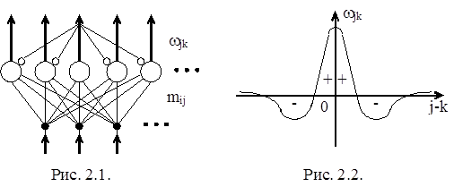 Структура нейронной сети, в которой реализуется формирование карт признаков, приведена на рис. 2.1. Нейроны, имеющие сигмоидную характеристику, расположены в виде одно- и двумерного слоя слоя по аналогии со слоистым строением коры. На каждый нейрон поступают два вида связей: mij , которые интерпретируются как связи от сенсорных входов или из других областей, и wjk - латеральные связи от нейронов одного слоя, характер которых зависит от расстояния между нейронами. Функция взаимодействия нейронов одного слоя имеет вид “мексиканской шляпы” (рис. 2.2.), что соответствует некоторым нейробиологическим данным. Близко расположенные нейроны возбуждают друг друга, с увеличением расстояния возбуждение сменяется торможением, а затем опять появляются слабые возбуждающие связи, которые по-видимому, выполняют ассоциативные функции и в данной модели не используются.
