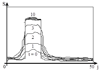Эффект наличия латеральных связей с радиусом действия порядка размеров сети проявляется в следующем. Если на каждый нейрон подать (например, через связи от сенсорных входов mij ) имеющий небольшой максимум случайный сигнал Si , то в процессе релаксации сети осуществляется повышение его контрасности. В результате вокруг первоначального максимума образуется “пузырек” выходной активности нейронов (рис. 2.3.).