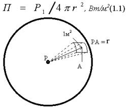 Обозначая через Р1 излучаемую источником мощность, определим плотность потока энергии (вектор Пойнтинга) на расстоянии r от источника радио волн (рис.1), основываясь на том, что излучаемая энергия равномерно распределяется по поверхности сферы радиуса r. Выражая мощность излучателя в Вт , а линейные размеры - в м , получим для численного значения вектора Пойнтинга выражение