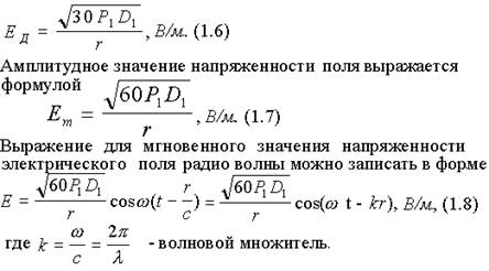 Таким образом, направленная антенна по создаваемой ею в месте приема напряженности поля эквивалентна изотропной антенне, которая излучает в D1 раз большую мощность. Это позволяет представить формулу для напряженности поля, создаваемой в свободном пространстве направленной антенной, в следующем виде: