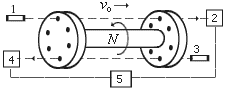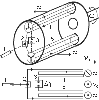 Свет от источника 1 (лазера) после расщепления 2 проходит через линии задержки 4 и 5 (катушки с намотанным световодом длиной L и показателем преломления n), с выхода которых световые сигналы поступают на фазовый дискриминатор 3, регистрирующий сдвиг фаз (∆φ) в момент, когда катушки занимают определенное положение в пространстве. Фазовый дискриминатор и катушки жестко крепятся к цилиндру. Цилиндр со световодами вращается с угловой скоростью ω, так что направление вектора линейной скорости катушек (u) меняется (u=ωr, где r – радиус цилиндра). Абсолютная скорость Земли определяется по формуле: