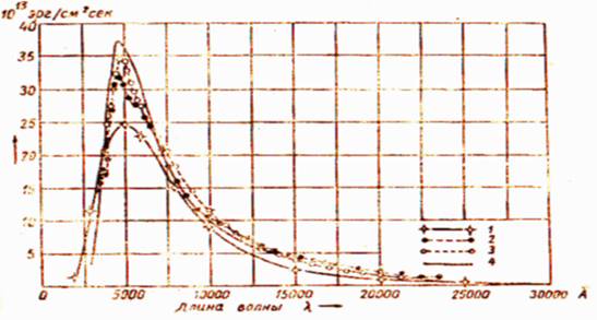 Рис.1. Распределение энергии в спектре солнечной радиации на границе атмосферы: 1- по данным 1903-1910 гг., 2 - 1920-1922 гг., 3 - 1917 г., 4 - абсолютно черное тело при температуре 57130 К.