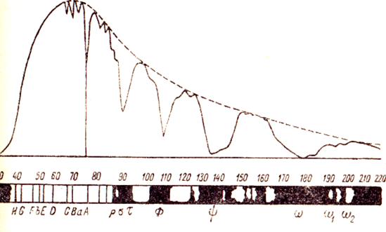 Большинство происходящих в атмосфере явлений, изучаемых оптиками и метеорологами, развиваются за счет лучистой энергии, т.е. энергии, доставляемой Земле солнечной радиацией. Мощность этой энергии примерно может быть оценена в 18*1023 эрг/с. Энергетический спектр солнечной радиации на границе атмосферы близок к спектру абсолютно черного тела с температурой порядка 60000 К (рис.1.[ 1 ] ).