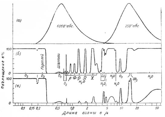 Рассмотрим избирательное поглощение лучистой энергии в атмосфере. Любое вещество имеет свои полосы поглощения (рис.3.[1] ). Из газов, входящих всегда в состав атмосферы, существенным для нас селективным поглощением обладают лишь O2 , O3 , CO2 и водяной пар H2 O. Кислород вызывает интенсивное поглощение света