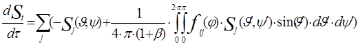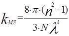 где Si - параметры Стокса (S1 =I - суммарная интенсивность, S2 =I*p*cos(Y0 ), Y0 - угол поворота направления максимальной поляризации относительно плоскости референции, p - степень линейной поляризации, S3 =I*p*sin(Y0 ), S4 =I*q, q - степень эллиптичности поляризации),fij - матрица рассеяния. При молекулярном рассеянии диполи под действием падающей волны начинают двигаться с ускорением, следовательно излучают волны с частотой падающей волны, т.е. происходит рассеяние света на данных молекулах. Рассмотрим коэффициент молекулярного ослабления kMS и учтем, что рассеяние должно происходить тогда, когда показатель преломления частицы относительно среды n не равен единице, тогда: