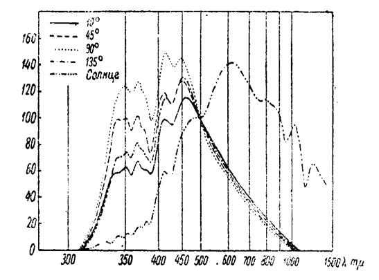 Рис.4. Распределение энергии в спектре рассеянного света, посылаемого различными точками небесного свода.