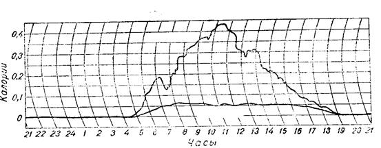Рис.5. Рассеянная радиация атмосферы при безоблачном небе и при сплошной облачности (10 баллов).