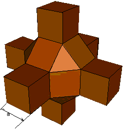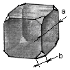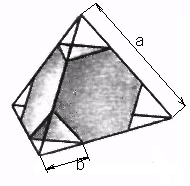 Его объем определится как объем исходного куба со стороной а, за минусом объема восьми отсеченных углов со стороной b. Заметим, что отсеченные углы составляют октаэдр со стороной b.