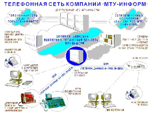 Телефонная сеть компании "МТУ-Информ" предназначена для оказания разнообразных телефонных услуг индивидуальным и корпоративным клиентам г. Москвы. Сеть базируется на принадлежащих компании электронных цифровых АТС, а в качестве транспортной среды используется . Номерная емкость составляет в настоящее время примерно 100000 номеров, входящих в нумерацию Московской городской телефонной сети. Таким образом, по числу обслуживаемых абонентов компания "МТУ-Информ" является вторым после АО "МГТС" оператором телефонной связи в Москве. Телефонные услуги, предоставляемые "МТУ-Информ", отличает высокое качество. Его составляющие — хорошая слышимость, надежность установления соединения, стабильность параметров сигнала и т. д. Располагая собственной транспортной сетью, равномерно покрывающей практически весь город, "МТУ-Информ" имеет возможность обеспечивать связь с абонентами МГТС, доставляя сигнал к центральной АТС компании по своей цифровой сети. Устаревшие аналоговые АТС, на которых в значительной степени происходит потеря качества сигнала, при этом не используются. Центральный узел сети "МТУ-Информ" имеет выходы на другие города и за пределы России через СП "СЦС Совинтел" и АО "Ростелеком". Благодаря высоким характеристикам телефонной сети "МТУ-Информ" ее услугами пользуются: