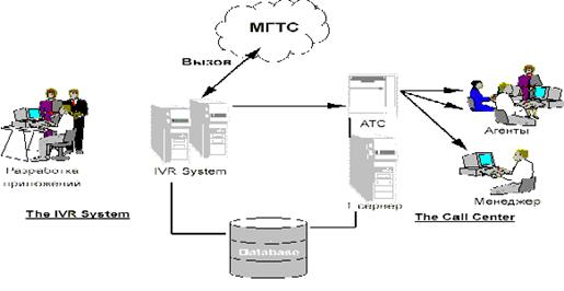Структуру Центра можно представить в виде блоков IVR (Interactive Voice Response) и Call Center. В IVR разрабатывается и запускается сценарий обработки вызова абонента, определяются набираемые цифры в процессе диалога с системой, определяется номер абонента, выдаются речевые сообщения и подсказки, генерируются переменные данные сообщения (числа, даты и др.), осуществляется авторизация, биллинг и доступ к базам. Основой Call Center является T-Server, который поддерживает агентские приложения (agent applications), управляет телефонной станцией, распределяет подключение агентов (Intelligent Call Delivery), отслеживает их работу и поток вызовов (Monitoring). Данные накапливаются и обрабатываются в сервере статистики (Stat Server). В сервере баз данных (DB Server) хранятся базы, необходимые для работы агентов. Также агенты могут использовать данные из глобальной сети и локальных баз арендаторов ресурсов Узла.