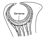 В проксимальной области ретинулярной клетки под электронным микроскопом видны многочисленные протонейрофибриллы, характерные для аксона; митохондрии обычно смещены в периферическую область,. что также характерно для аксона; рабдомер здесь постепенно сходит на нет. Проксимальный конец рабдома, представляющий собой оптический волновод обычно закрыт «оптической пробкой» (Грибакин, 1967), состоящей из утолщений интерретинулярных тяжей, заполненных гранулами экранирующего пигмента. Такая «пробка», очевидно, препятствует проникновению света в более высокие отделы зрительного тракта, где свет (и в особенности ультрафиолетовое излучение) может вызывать нарушение работы клеток оптических центров.