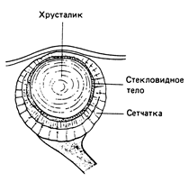 Глаза позвоночных, хорошим примером которых служит глаз человека, построены по единому плану, хотя и у них отмечается некоторая экологическая адаптация. На рис. 3 показан горизонтальный разрез человеческого глаза. Он окружен плотной оболочкой – склерой. прозрачной в передней части глаза, где она называется роговицей. Непосредственно изнутри роговица покрыта черной выстилкой – сосудистой оболочкой, которая снижает пропускающую и отражающую способность боковых частей глаза. Сосудистая оболочка выстлана изнутри светочувствительной сетчаткой, которую мы более детально рассмотрим позднее. Спереди сосудистая оболочка и сетчатка отсутствуют. Здесь находится крупный хрусталик, делящий глаз на переднюю и заднюю камеры, заполненные соответственно водянистой влагой и стекловидным телом. Перед хрусталиком расположена радужка – мышечная диафрагма с отверстием, называемым зрачком. Радужка регулирует размеры зрачка и тем самым количество света, попадающее в глаз. Хрусталик окружен ресничной мышцей, которая изменяет его форму. При сокращении мышцы хрусталик становится более выпуклым, фокусируя на сетчатке изображение предметов, рассматриваемых вблизи. При расслаблении мышцы хрусталик уплощается и в фокус попадают более отдаленные предметы.