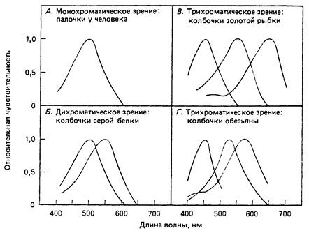 Колбочки наиболее чувствительны к сильному освещению и обеспечивают острое зрение, так как с каждой ганглиозной клеткой связано лишь небольшое их число. Они могут быть разных типов, обладая специализированными фотопигментами. поглощающими свет в различных частях спектра. Таким образом, колбочки служат основой цветового зрения. Они наиболее чувствительны к тем длинам волн. которые сильнее всего поглощаются их фотопигментами. Зрение называют монохроматическим, если активен лишь один фотопигмент, например в сумерках у человека, когда работают только палочки (рис. 4 ).